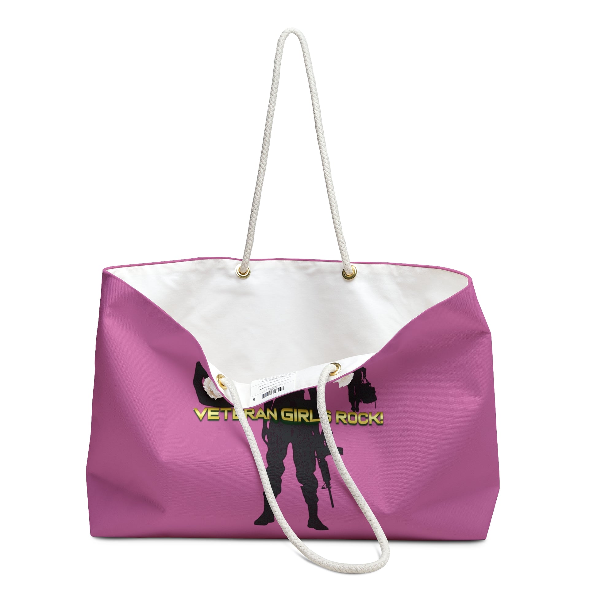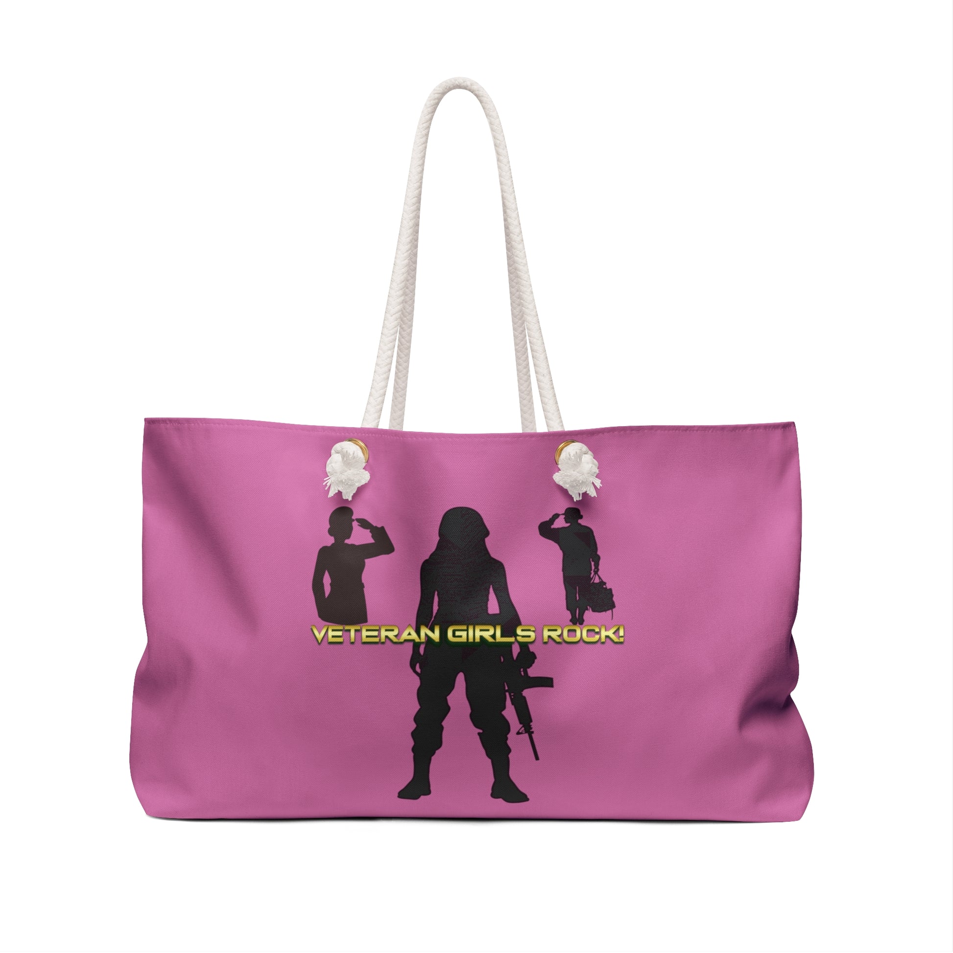 Our oversized Veteran Girls Rock Weekender Tote Bag is perfect for your weekend at the beach out of town. The wide-mouthed, durable bag holds a generous amount of personal items and is easily held by its thick rope handles.